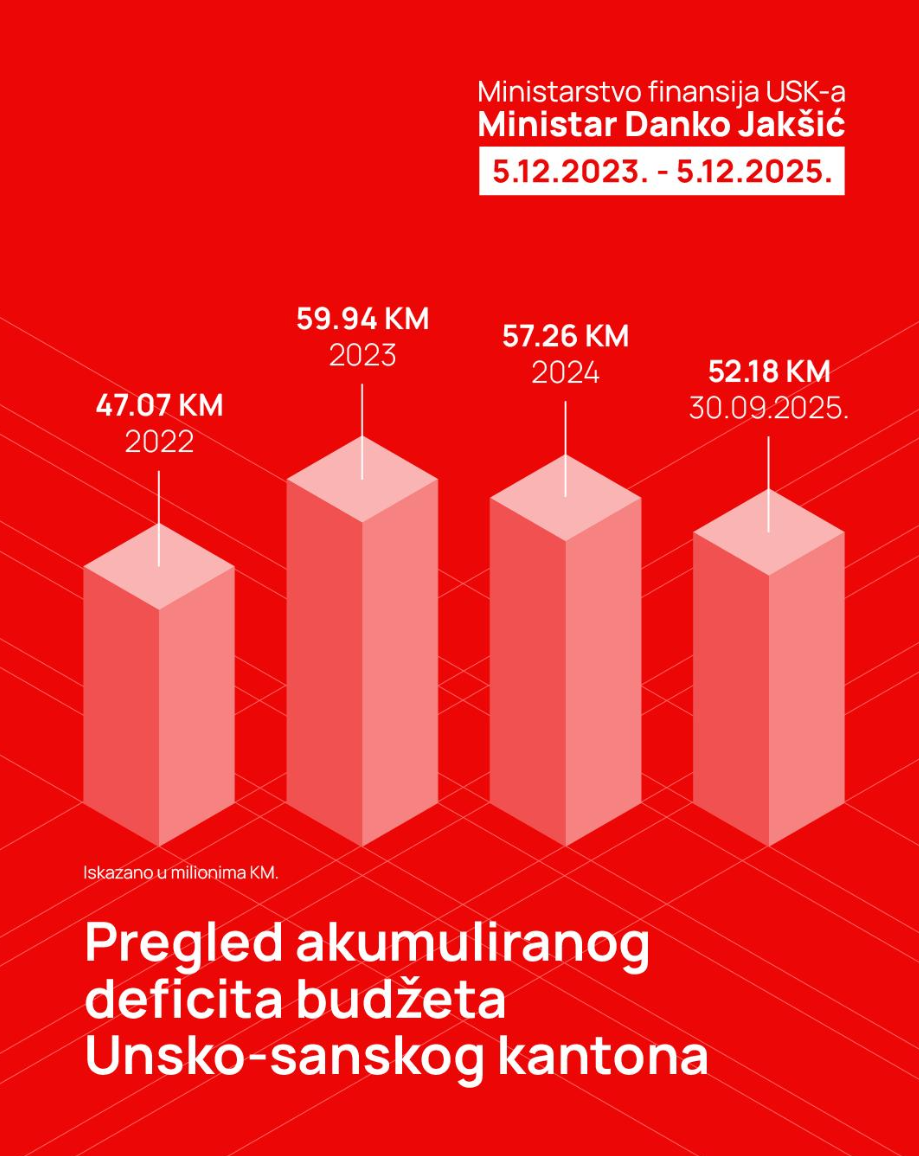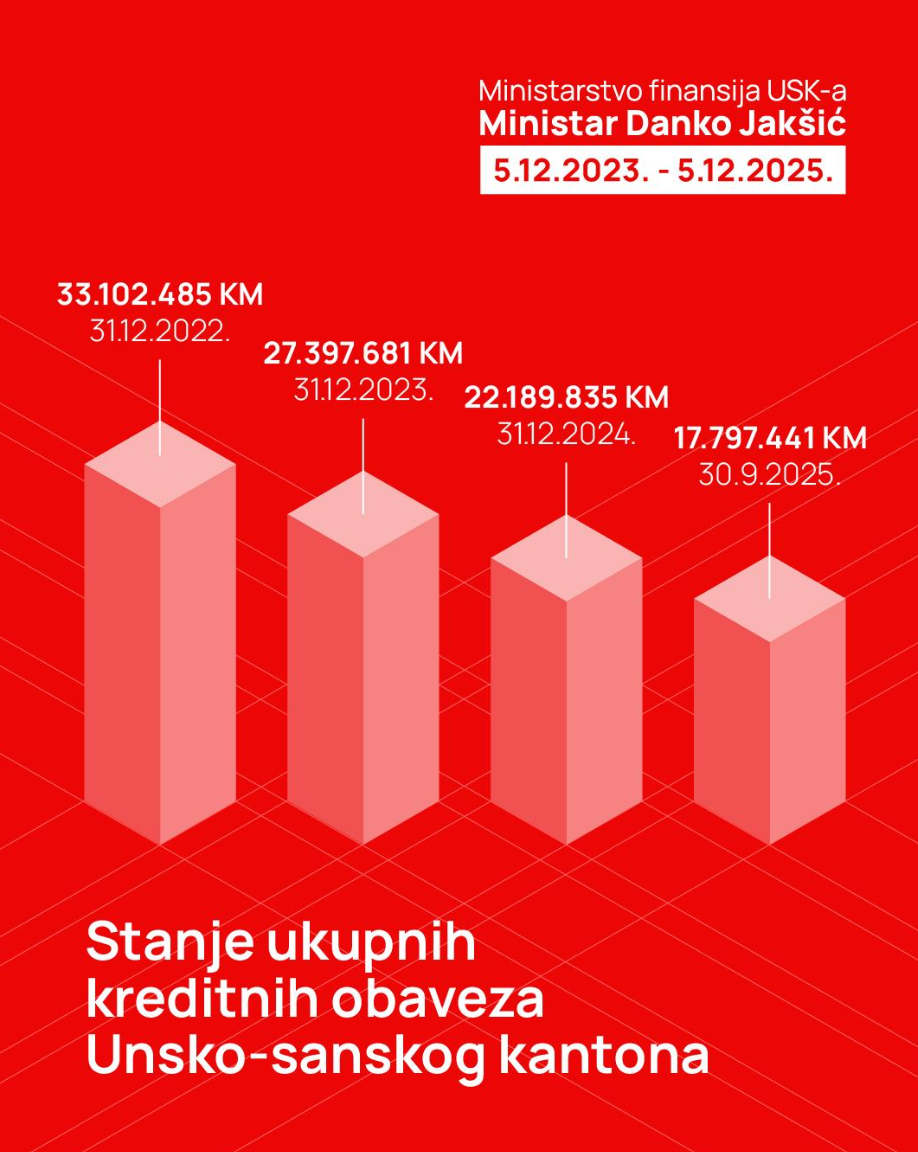 Uporedo s tim, Unsko-sanski kanton bilježi i snažno smanjenje ukupnog kreditnog zaduženja. Ukupne kreditne obaveze, koje su krajem 2022. iznosile 33,1 milion KM, do kraja trećeg kvartala 2025. spuštene su na 17,8 miliona KM. Više od 15 miliona KM otplaćenog duga u tako kratkom periodu potvrđuje da Kanton prvi put nakon dugo vremena bilježi stabilan i održiv pad kreditnih obaveza, čime se značajno smanjuje pritisak na buduće generacije i ostavlja više prostora za ulaganja u razvojne projekte. Ovo je i strateški Jakšićev cilj – doprinijeti stvaranju okruženja sigurnog za investicije i budući razvoj.