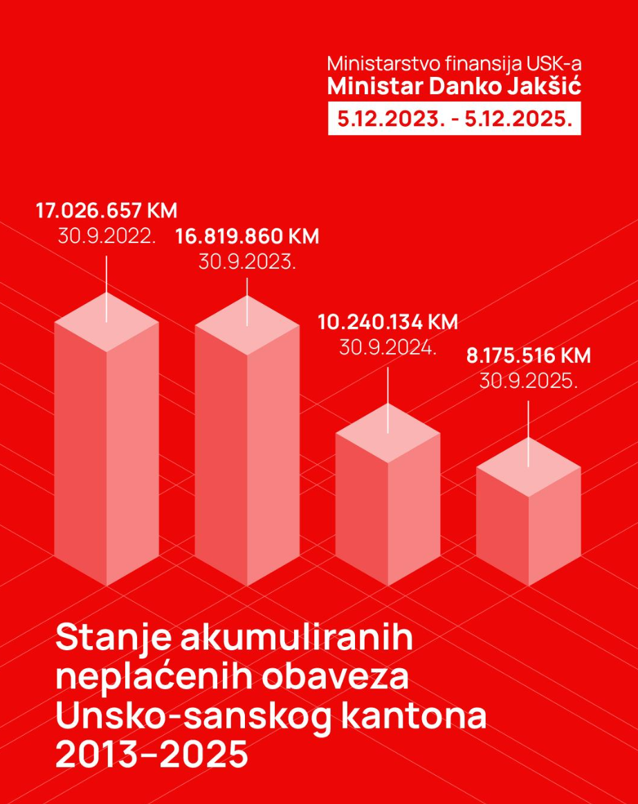 Poseban iskorak ostvaren je u smanjenju akumuliranih neplaćenih obaveza, koje su godinama predstavljale jedan od najvećih tereta kantonalnih finansija. Dok su krajem trećeg kvartala 2023. godine iznosile gotovo 17 miliona KM, do trećeg kvartala 2025. godine taj iznos je smanjen na 8,1 milion KM. Time je, u periodu od samo dvije godine, iz strukture finansija uklonjeno gotovo devet miliona KM zaostalih obaveza, što predstavlja najveći pad iznosa dugovanja, ostvaren u posljednjoj deceniji. Ovo pokazuje jasno opredjeljenje za uredno i transparentno izvršavanje budžeta, naveo je Jakšić.