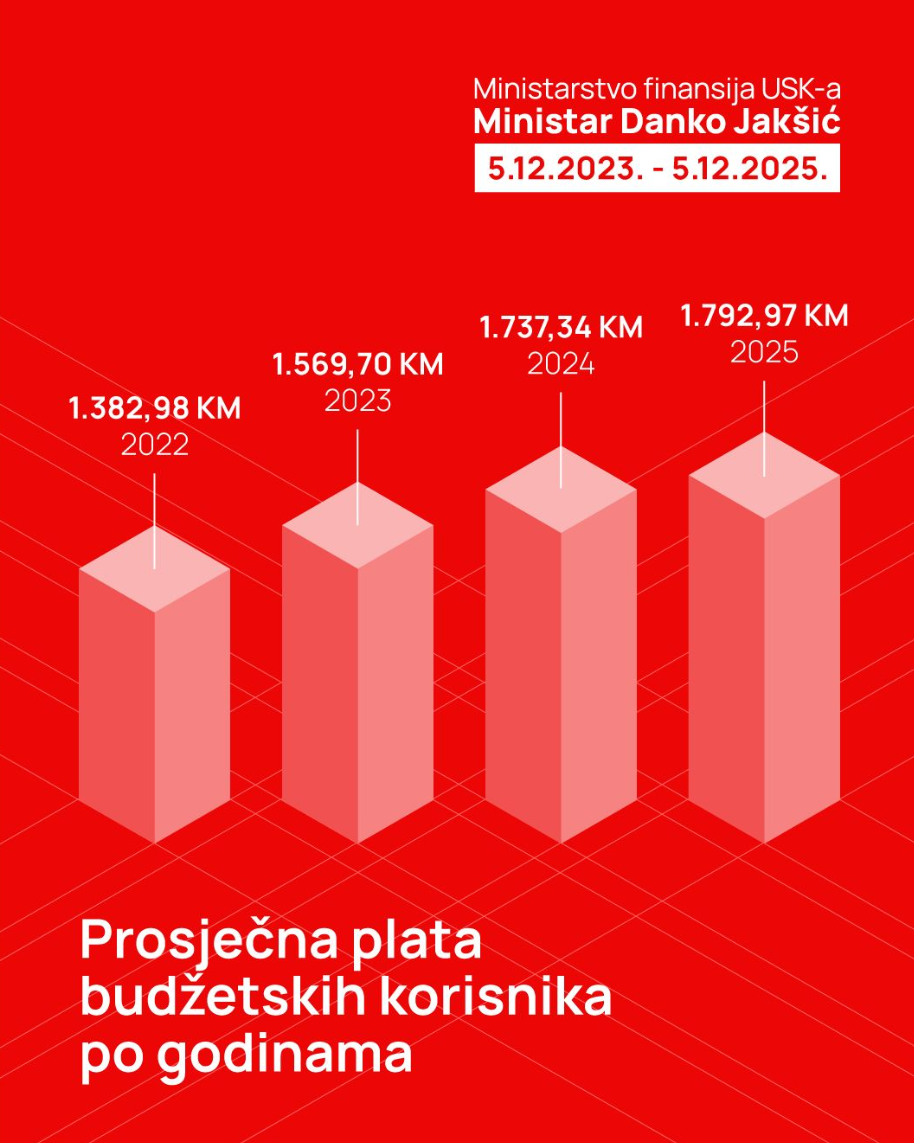 Stabilizacija budžeta omogućila je i poboljšanje standarda zaposlenih u javnom sektoru. Prosječna plata budžetskih korisnika kontinuirano je rasla te je sa 1.382 KM u 2022. godini dostigla 1.792 KM u 2025. godini. Povećanje od skoro 30% rezultat je zdrave budžetske strukture, dosljedne fiskalne politike i posvećenosti Vlade da ojača status zaposlenih u obrazovanju, policiji, pravosuđu, zdravstvu i upravi. Poboljšanje standarda zaposlenih direktno utiče i na kvalitet pruženih javnih usluga građanima.
